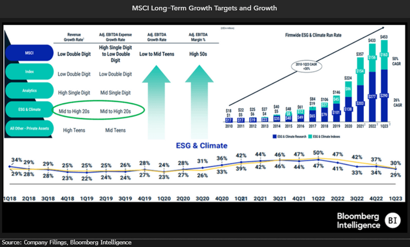 Exchanges including ICE, CME, Deutsche Boerse and Nasdaq could see meaningful ESG product revenue over time, though the cycle may be transitioning from accelerated early adoption to a more sustainable — but still elevated — trajectory. Index providers’ opportunity is aided by the SEC’s climate plan, which could support growth well into the double digits. Data services, reporting and clearing are incremental.