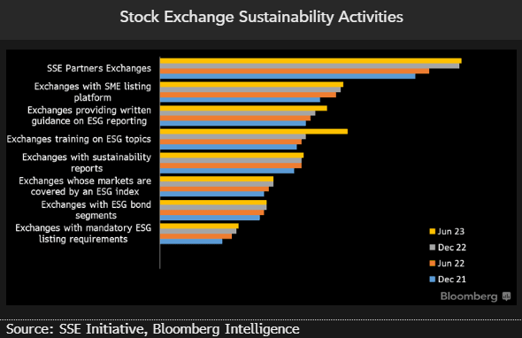 The Sustainable Stock Exchanges (SSE) initiative recorded continued ESG adoption, with a larger number of exchanges focused on the asset class as well as resources and platforms. However, we note more a marginal expansion in our most recent observation vs. prior periods. SSE looks at a wide range of factors, including boardroom diversity, regulations, reporting, climate action and sustainable partnerships. We believe the growth highlights investor demand for ESG products and exchanges’ commitment to related analytics tools, as well as their self-regulatory power that can encourage company reporting.