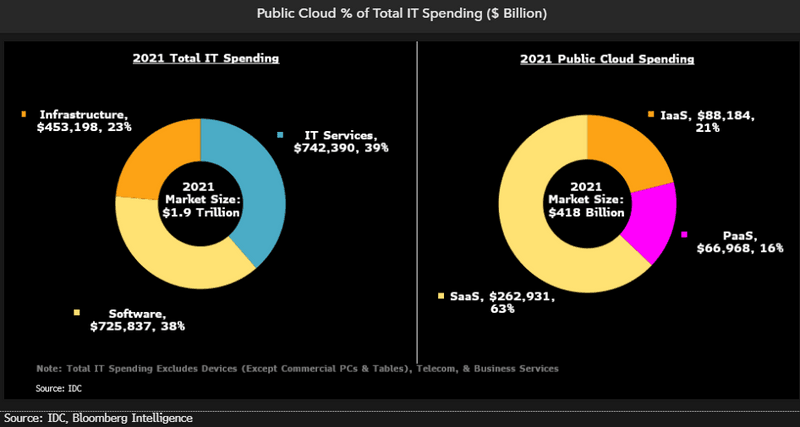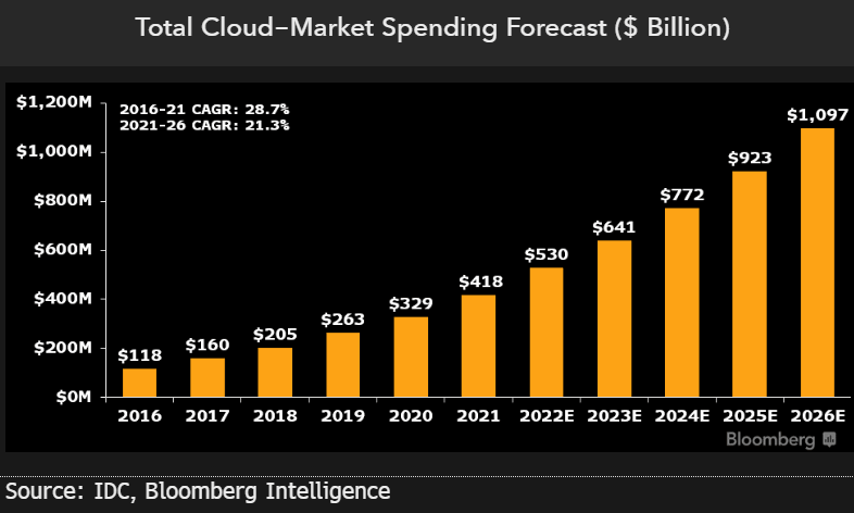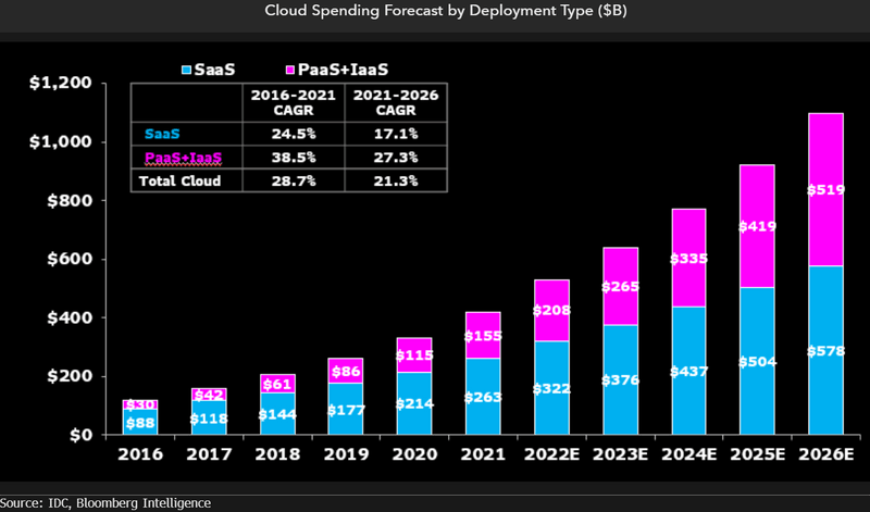 The shift from on-premise infrastructure and applications is the primary driver of revenue growth in the technology industry, yet this expansion could soften until at least 2H23 given a deteriorating economy. The market for public cloud, which includes infrastructure and applications, may reach $1.1 trillion by 2026 from $418 billion in 2021, increasing 21% annually, IDC data show.