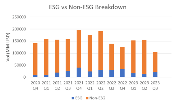 Sustainable debt financing continues to gain traction in the loan market this quarter. This is partly influenced by the shifts in laws and regulations standards which now emphasize ESG reporting, as well as growing investor interest in ESG-aligned investment opportunities.
