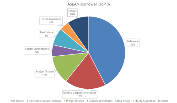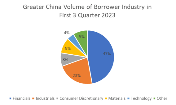 In terms of Greater China borrower industries, Financials and Real Estate remained the most active with 47% in market share, followed by Industrials (23%) and Materials (9%) industries. According to Bloomberg data, the majority of loans issued to real estate companies since Q1 were for refinancing and capital expenditure purposes. With the ongoing debt crisis in the Chinese property sector and restructurings across the larger market, new loan issuance in this region has taken a more conservative turn.