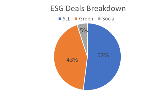 Among the ESG financing instruments, SLL and Green loans remained the most widely issued instrument types, making up 95% of all ESG-related loans. There were no transition finance deals for this quarter.