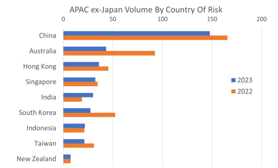 The APAC ex-Japan syndicated loans market volume in the first 3 quarters of 2023 dropped by 30% in comparison to the same period last year, making it the second lowest activity level of issuance volume within 10 years since 2013. The total issuance amount across APAC ex-Japan reached USD 352.6 billion over the first 3 quarters of 2023, with 33% and 18% of that volume issued in USD and CNY respectively.