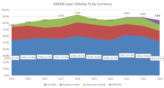 One particular flavor of the year has been the preference for loans denominated in local and regional currencies. US dollar policy rates continue to stay elevated and have pushed the regional borrowers to look at alternative financing currencies. The percentage of syndicated loans denominated in US dollars amongst ASEAN borrowers lost a 7.5% share and experienced a downward trajectory for the second consecutive year, sitting at the lowest level in 10 years. Regional loans in CNY and CNH have always been on the sidelines, until now. The market witnessed a drastic emergence of loans denominated in CNY and CNH this year with 6 deals totaling 6.2 billion USD equivalent and taking up to 7.3% market share. The borrowers on these loans come from diverse backgrounds in transportation, commodities and real estate.