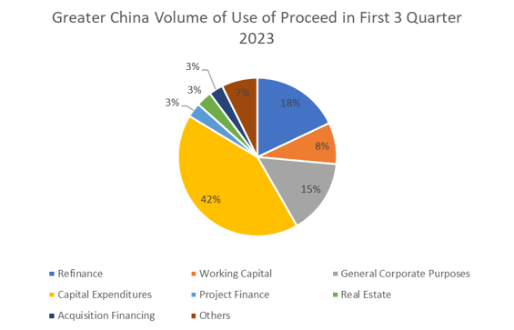 In terms of borrowing volume, China and Australia remained as the two markets with the highest demand throughout 2023 with market shares of 40% and 12% respectively. While South Korea’s borrowing activity dropped from the 3rd in Q2 to 6th in Q3, Hong Kong came up to take its place with a market share of 10%. For the loans volume issued within Q3, refinancing (33%) and general corporate purposes (18%) accounted for roughly half of the loan purposes, both of which were also the leading use of proceeds in H1.