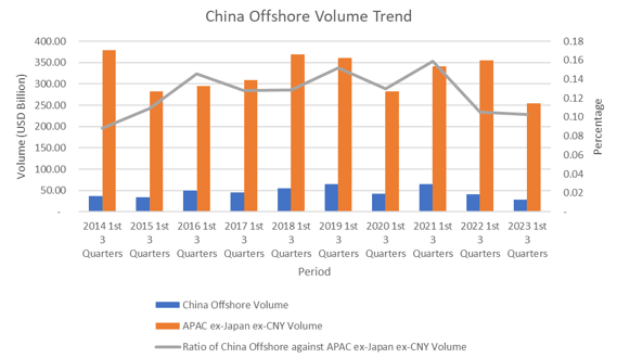 Syndicated lending in Greater China dropped by 17.82% year-on-year, with a total issuance volume of USD 2,006.22 billion so far in 2023, reflecting with the market’s slow performance. The retreat of Taiwanese bank participation in syndicated or club loans to Chinese borrowers is also evident in the drop to 2.21% this year, a record low in the last 10 years. However, the ratio of issuance volume between the Greater China region and the overall APAC ex-Japan region has only slightly increased from 0.51 to 0.53 despite the slow market recovery. According to newly released China Offshore and APAC ex-Japan ex-CNY league tables, the loan volumes in the first 3 quarters of the year saw a 30.23% and 29.40% decrease respectively in comparison to the same time period in 2022, also marking record lows in issuance volume over the past 10 years.