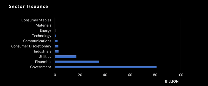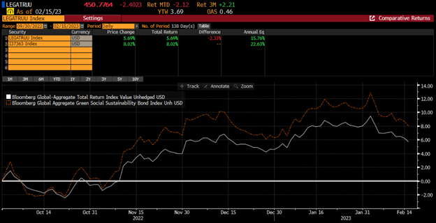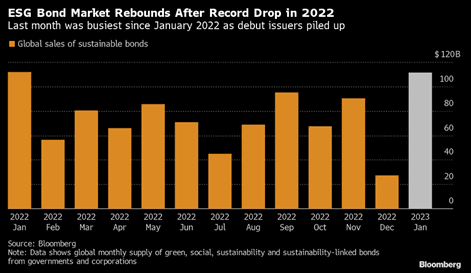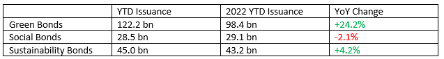 Sustainable bond issuance is off to a strong start after a challenging 2022 caused by rising rates and market volatility limiting issuers’ interest. Corporate and Government new bond issuance YTD is already up 23.1% YoY, bolstered by a surge in a sovereign issuance.