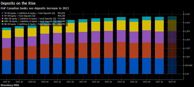 Analysts are expecting deposit growth across the Big Six Canadian Banks, with double digit year-over-year growths for Bank of Montreal, National Bank of Canada, and Bank of Nova Scotia. Deposits were also more resilient in Canada than the U.S.in Q2, with Canadian deposits for major banks up 1.7% PoP on average while U.S. deposits were down 4.0%.