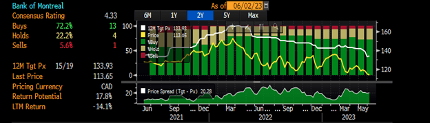 Net Interest Income guidance for the remainder of 2023 is generally premised on stable central bank rates, so future profitability is assumed by analysts to depend on the Federal Reserve and Bank of Canada’s desire to increase rates. Brokers predict RBC could gain interest income with HSBC Canada acquisition in 2024, padding their gains thus far. Analysts are particularly bullish on Bank of Montreal, with 72.2% of analysts recommending a buy of the firm’s stock.