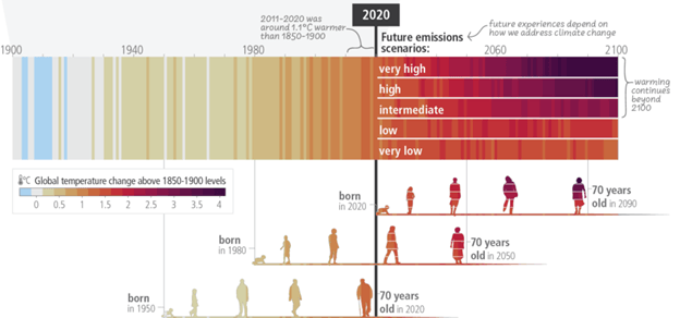 Figure 1: Extent to which current and future generations will experience a hotter and different world depends on our choices in the near-term (sourced from page 7 of this report)