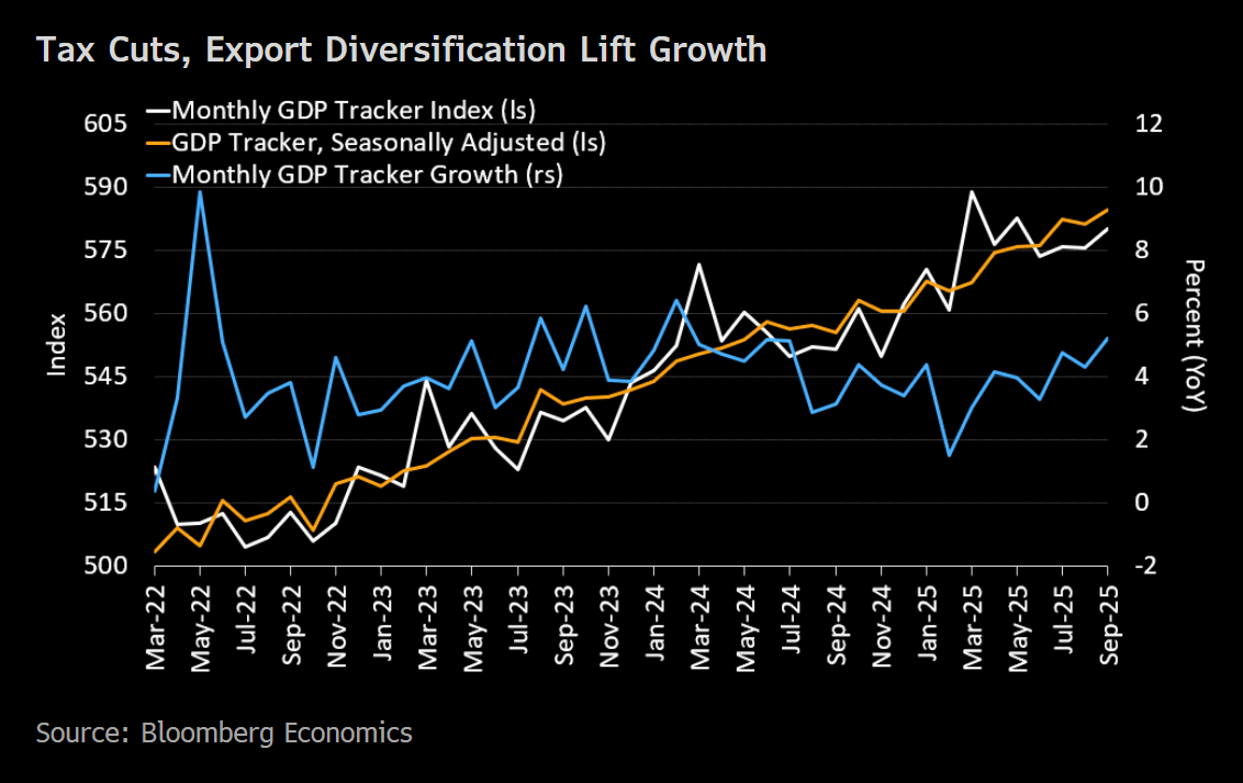 Rate-sensitive sectors also showed renewed momentum — capital goods investment, construction, and car sales all climbed, helped by GST cuts.