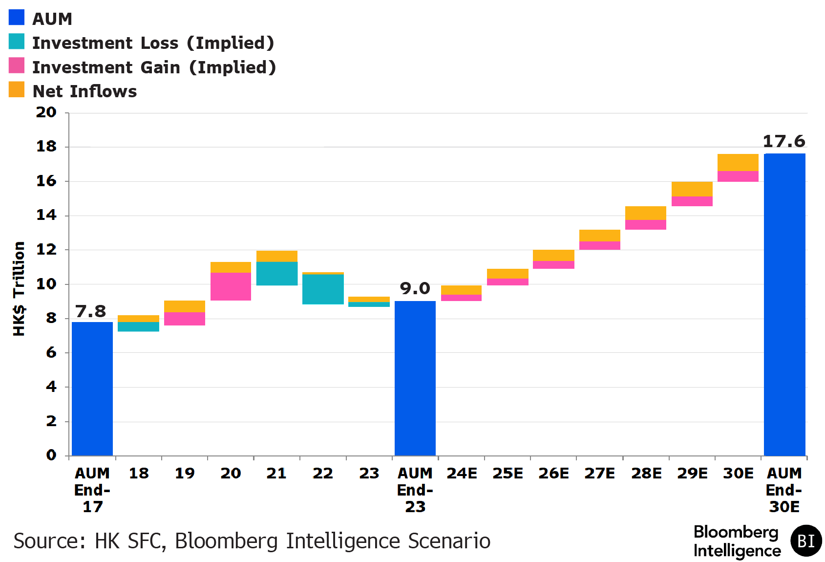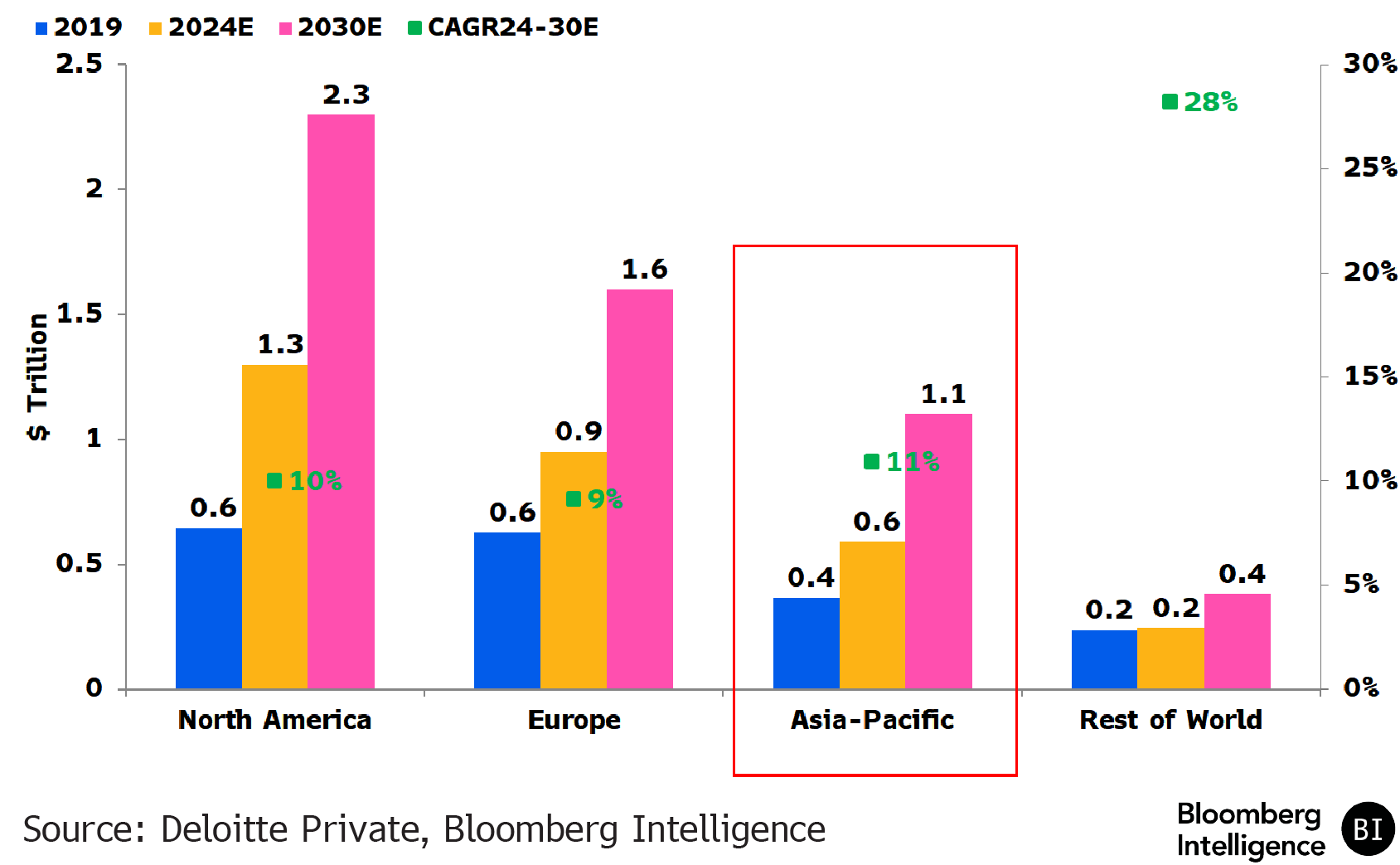 Hong Kong’s family offices and private trusts had $193 billion of AUM in 2023, according to the regulator’s survey, or about a third of the region’s AUM, and could double to HK$3 trillion ($386 billion) by 2030, we calculate, if growth keeps pace with the rest of the region. Family office AUM in the Asia-Pacific region could rise 11% per year on average to $1.1 trillion by 2030 from $590 billion in 2024, outpacing annual global growth of 9.7% according to Deloitte. Singapore doesn’t disclose AUM of family offices.