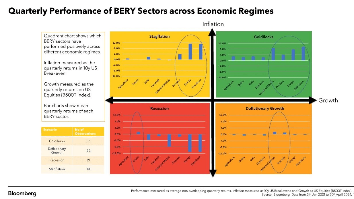 In the midst of market volatility and elevated inflation levels, commodities have emerged as a resilient asset class, offering investors a hedge against uncertainty and a source of positive returns. Building upon the success of the BERY Index launched in June 2021, the BERY Sectors indices extends those benefits to the thirteen individual sectors within the Bloomberg Enhanced Roll Yield: Energy, Petroleum, Industrial Metals, Precious Metals, All Metals, Energy & Precious Metals, Grains, Grains plus Derivatives, Softs, Agriculture, Livestock, Agriculture & Livestock and BERY ex-Agriculture & Livestock.