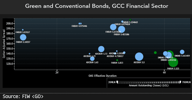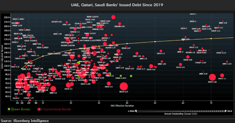 Gulf lenders need to make progress on green-bond issuance to align their roadmaps with net-zero targets and attract foreign institutional investors with ESG mandates. As host of COP28, the UAE and its neighbors are in the spotlight and ESG debt potentially offers hope of a quicker transition to net zero. Yet to align the interests of investors and issuers, green-bond debt costs need to come down to lower levels with relevant impact reporting.