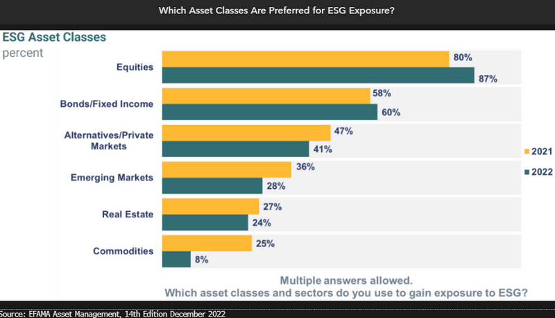 Almost two-thirds of global investors prefer active funds to integrate ESG, with equity (80%) and bonds (58%) the most sought-after assets, based on a 2022 Capital Group study. Among those surveyed, meeting client needs (27%, tilted toward US-based investors) and making a positive impact (25%, tilted toward Europe) are the most-cited motivations for adopting ESG. Asian investors tend to focus on improving ESG metrics, while usage of emerging-market assets (fourth-most popular) fell last year.