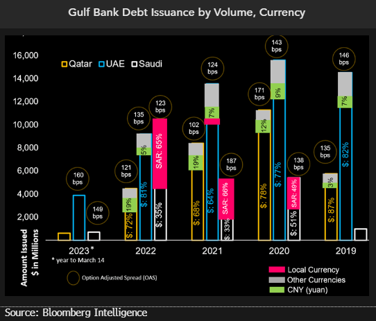 Dollar issuance is dominant in the region, except for at Saudi banks, which issue liquidity and capital needs in local currency. The provision of yuan debt has been high in Qatar over the past three years.