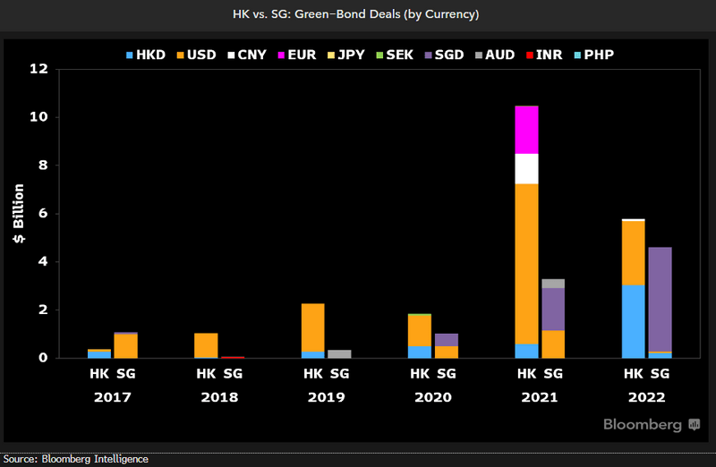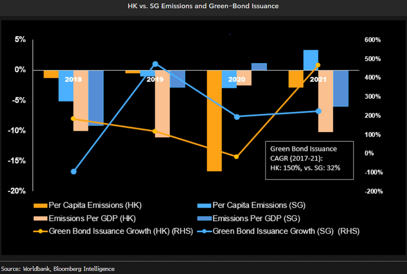 The Hong Kong and Singapore governments are seeking to promote green and sustainable financing in the long term, as they set clear bond-issuance targets. Hong Kong leads in issuing notes in different currencies and offshore yuan bonds. Its green-debt growth outpaced Singapore’s in 2017-21, which might have partly contributed to its faster CO2 emissions cut too.