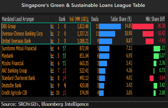 Singapore’s banks may leverage sustainable finance to drive loan growth in 2022 amid heightened efforts to combat climate change. Such loans could gain pace in the medium term, we think, as borrowers increasingly incorporate sustainability into their business models. The carbon tax announced in the budget effective 2024 might also offer an impetus for businesses and individuals to reduce their carbon footprint and align with national climate goals, leading to incremental green-financing loan growth for the banks. DBS topped the green and sustainable loans league table in Singapore for 2021.