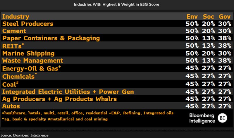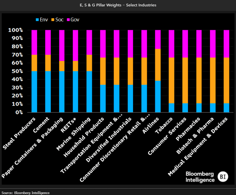 Bloomberg’s E&S scores reflect performance on industry-specific issues. Governance is treated as sector-agnostic and was assigned the same point value for all industries. E and S points were assigned based on an assessment of the timing, magnitude and probability of financial impact. Each pillar’s points were divided by the total to derive weights.