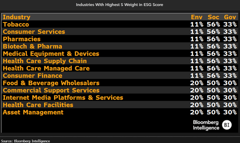 Among the 88 industry peer groups in Bloomberg’s ESG scoring universe, tobacco, select retail, health care, finance and Internet media industries are the most exposed to social factors, accounting for 50-56% of the combined ESG score. Though growing and processing of tobacco impacts the environment, in Bloomberg’s assessment of financial impact, this pales in comparison to the risks associated with customer welfare and related risk of government regulation.