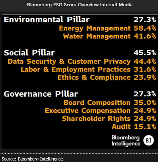 Social factors are deemed most material for the internet media industry, representing 45% of the combined ESG score vs. 27% for environmental factors. The industry’s data centers are heavily dependent on energy and water for cooling. These resources are threatened as temperatures rise and droughts persist. But in our assessment, this is eclipsed by social factors, particularly the need to protect data privacy.