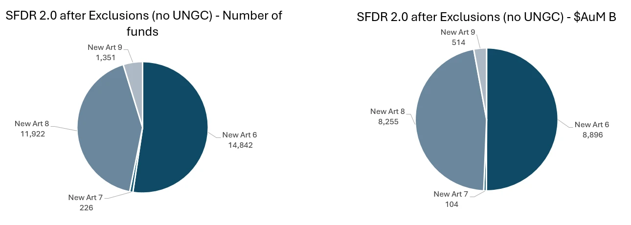To perform this analysis, we mapped the transition from SFDR 1.0 to SFDR 2.0 by reclassifying existing Article 6, 8, and 9 funds into the new Article 6, 7, 8, and 9 categories based on naming, isolating ‘transition’, ‘sustainable’ and ‘impact’ strategies. We then applied SFDR 2.0 aligned Paris Aligned Benchmark exclusions using fund look-through to test which funds would qualify, excluding UN Global Compact and OECD violations where no regulatory threshold has been defined.