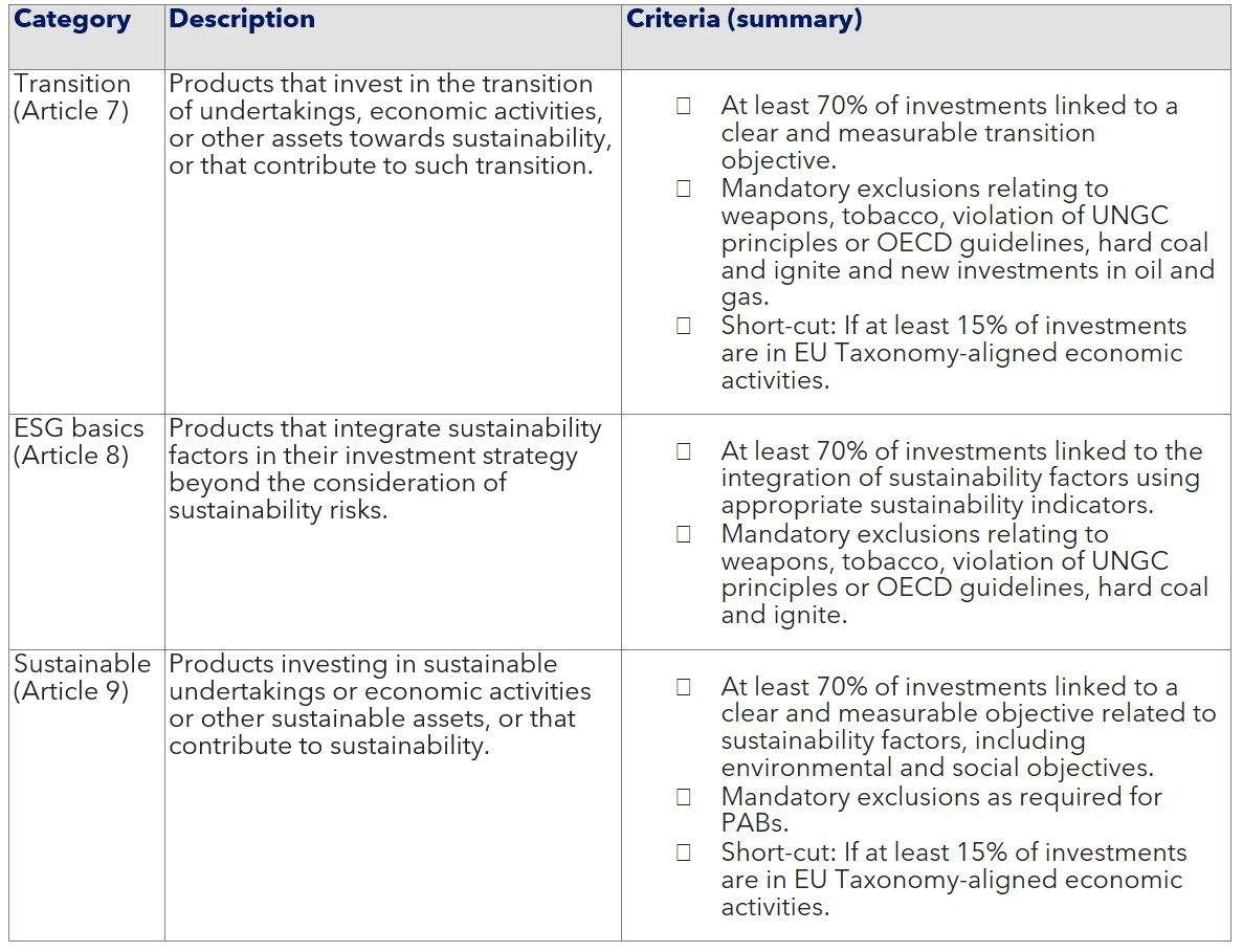 One of the biggest changes is the removal of Articles 8 and 9, which are replaced with three formal product categories: Transition, ESG Basics, and Sustainable. In addition to these labels, the regime introduces new criteria, minimum investment thresholds and strict exclusions (see table below.)