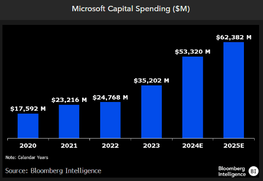 Microsoft is at the forefront of capital spending among big tech providers, followed closely by Google and AWS, which we believe will mostly go toward expanding their respective data-center footprints and buying more AI-related chips and hardware. We calculate Microsoft’s capital outlay could hit $53 billion in 2024 and $62 billion in 2025, mostly to meet greater demand for OpenAI workloads, both from consumers and companies. For reference, Microsoft had $17.6 billion in capital expenditures in 2020, and the 2025 amount would likely be more than 3.5x that amount, with majority of incremental spending tied to cloud services.