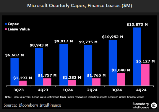 Leases tied to capital expenditures over the past 12 months totaled $11 billion for Microsoft, roughly 20% of the total outlay of $56 billion. Our calculations lead to $13.6 billion of spending tied to leases in 2025, which can be viewed as easier to shut down if demand dries up.