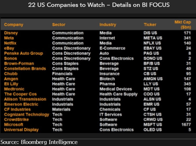TMT has its fair share of our US ideas, where we see new developments not yet reflected in depressed expectations, such as for Netflix, Microsoft, CrowdStrike and Disney. We also believe there’s further risk to consensus for Meta. Health care is represented with new advances for diabetes (Eli Lilly), cardiovascular disease (Medtronic) and vision (Cooper), but Amgen may miss on a key lung cancer drug.