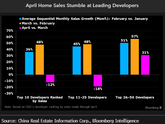Residential home sales for China’s 10 largest developers plunged 12% sequentially in April, reversing some gains from February and March. Smaller developers — ranking 11 to 25 — fared worse, with April sales tumbling 18% after rising 48% in March. Home sales are on track to finish lower yet again in May, fanning concerns about China’s sputtering property-sector recovery, according to BI analyst Kristy Hung. Real estate accounts for about 20% of China’s GDP.