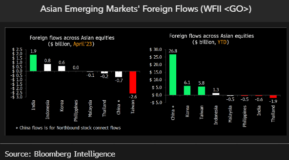 Emerging-market fund flows suggest fading exuberance around China’s reopening. China witnessed outflows during April, the first since Beijing abandoned Covid Zero late last year. Inflows were evident in India and Indonesia, and have been especially strong in Japan so far this year. Relighting the fuse on investors’ China fever could require using monetary policy to foster growth, stabilizing the property market, and some easing of US-China tensions, according to Bloomberg Intelligence senior equity strategist Marvin Chen.