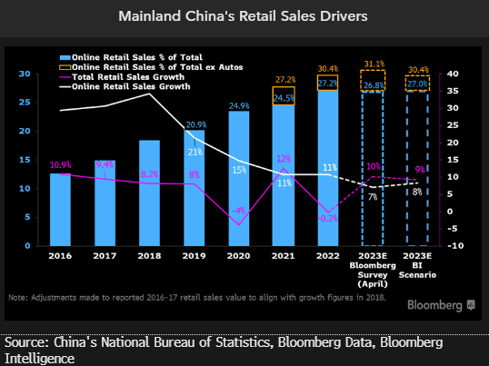 China’s 2Q retail sales growth might exceed the 11.9% consensus expects, powered by e-commerce receipts, according to senior analyst Catherine Lim. China’s April e-commerce retail sales leaped 22% on the back of aggressive shopping incentives from the likes of Alibaba and JD.com. That growth figure checks in at a stronger-than-expected 13% during the four months spanning January through April, and higher than the 9% growth at brick-and-mortar outlets. The disparity reaffirms the stickiness of e-commerce consumer buying patterns even after China’s abandonment of Covid Zero.