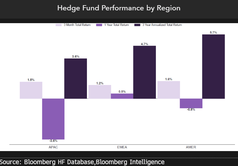 US-based hedge fund managers have performed the best over a three-year period, delivering 5.7% total returns, followed by EMEA at 4.7% and APAC at 3.6%. More recently, over the past year, EMEA-based managers have led with a 0.45% total return vs. minus 0.8% for the US and minus 3.63% for APAC-based managers.