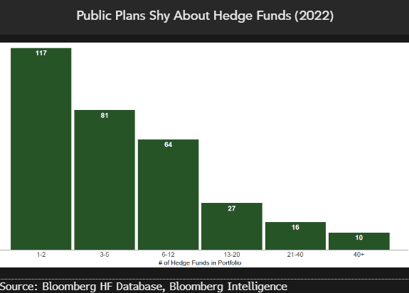 Public pensions are in desperate need of reducing duration on their alternatives portfolios because of higher interest rates and still generate mid- to high-single-digit absolute returns — making the return of hedge fund strategies imperative. Over the last few years, hedge funds have been whittled down from the portfolio allocations amid the public’s backlash toward hedge funds and as low rates juiced up private equity returns that weren’t marked to market. A vast majority of public funds we track report five or fewer hedge fund investments.
