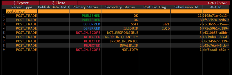 The trade is also submitted to RHUB to determine post-trade transparency eligibility. Similar to the pre-trade workflow, RHUB will determine if the instrument (liquidity) and the trade size require immediate post-trade transparency. RHUB will then send the trade to Bloomberg’s Approved Publication Arrangement (APA) for public dissemination. All relevant time stamps can be passed back to third party systems either though the IB API Service or TNP in real-time, should they choose to store or send them downstream to alternative reporting solutions. However, for RHUB clients, once the trade has been transferred downstream, users can benefit from a complete end-to-end integrated workflow as it can also be moved to BTCA (to support compliance with RTS 27 and 28), BVAULT (for immutable storage) as well as to the APA and ARM, depending on reporting requirements.