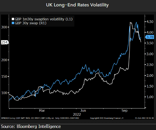 UK rates have been at the epicenter of volatility, helping to push up volatility in US and EU. While political volatility is high, the expectation of the lessons of fiscal responsibility has been learn and exit of “Trussonomics” can help see implied vol decay over the coming weeks from extremely distorted levels. This can see the 1m30y swaption volatility move closer to our macro model ex-realized vol of 180 bp/year. This is also close to where the yield level implies, based off the pre-mini-budget linear relationship at around 200 bp/year (see left-side link).