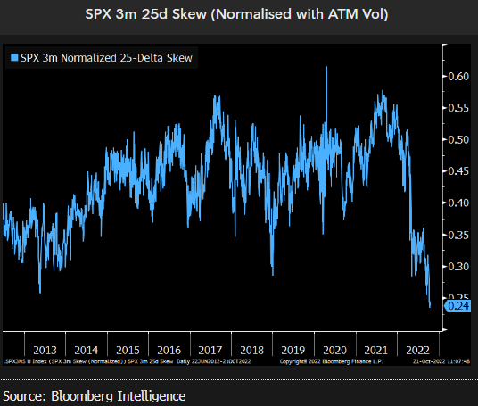 The flattening of the skew has reduced the discount that volatility KO options offer relative to vanilla puts. The grind lower in the market, monetization of hedges and less reactive vol to SPX declines is why the skew has been marked significantly lower this year, in our view. The absolute level of implied vol is high and therefore not expected to significantly increase further in a selloff, leading the skew to reprice lower.