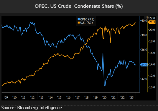 OPEC’s global crude and condensate-supply share has fallen 10 percentage points over the past decade, with almost all of this ground ceded to American shale producers. That’s driven up the US global supply share by 9 percentage points over the period.