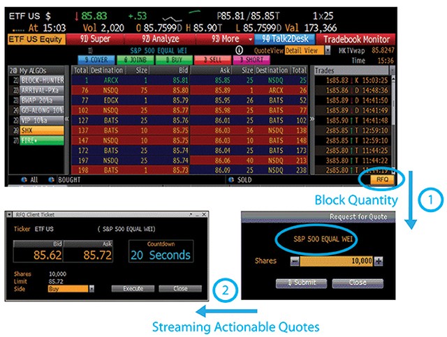 For relatively large orders sizes as a percentage of ADV, an Electronic RFQ based platform can obtain anonymous quotes on blocks from a network of liquidity providers, market-makers and authorized participants minimizing market impact. Authorized participants can initiate the ETF creation/redemption which can then be delivered to the trading entity.