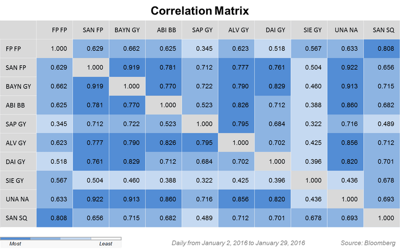 In our Alpha Trader Forum presentation, we described the components of pair algorithms. Using a correlation matrix, we pointed out that individual securities aren’t random walks, but are influenced by other securities or markets. For example, two pharmaceutical companies Sanofi [SAN FP] and Bayer AG [BAYN GY] have a significant correlation (0.919) with each other. Household products manufacturer Unilever NV [UNA NA] also has a significant correlation to each of them (0.922 vs Sanofi, and 0.913 vs Bayer AG), as they are all in the consumer sector. The audience recognized that their orders are not executed in isolation, but can be impacted by other market forces.