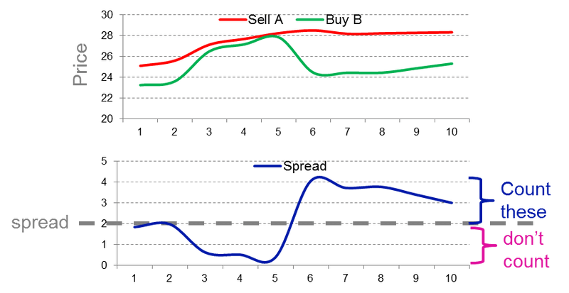 To illustrate how a pair algorithm works, let’s use a Spread example. As defined previously, a Spread is the price of security A minus the price of security B (price A – price B). In the diagram below, Selling A and Buying B, we’ll use the value of 2 as the spread to start trading the pair.