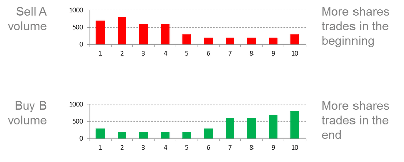 To illustrate with volume profiles, we have 2 orders (selling security A and buying security B) with the equivalent quantities to be executed. The two VWAP (Volume-Weighted Average Price) algorithms will independently complete each order. In the diagram below, selling security A could finish before the buy order in security B is completed, because more volume is trading for security A in the beginning.