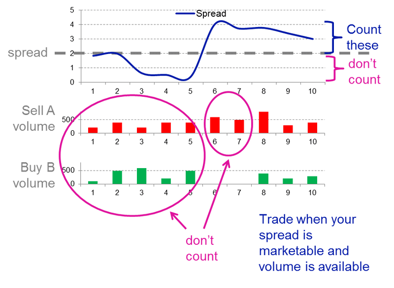 We described earlier a second condition for a pair algorithm to execute—when volume is available in both securities at the same time. Looking at the same spread example, after time period 6, the price spread is higher than our 2 limit, and should be executing. However, no volume traded for security B during time periods 6 and 7. Therefore, the pair algorithm will only start executing after time period 8 when both the price and volume conditions are met.