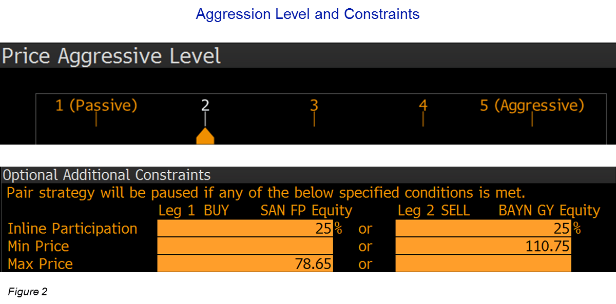 Controls and constraints are then applied to the individual legs and spread strategy, such as aggression levels and volume participation (Figure 2).  In addition, the specialized data required to nourish a pair algorithm ticket can be more intensive than a single stock algorithm.  This explains why cross-asset or pair algorithms have been slow to implement into customers’ OMS and EMS platforms.
