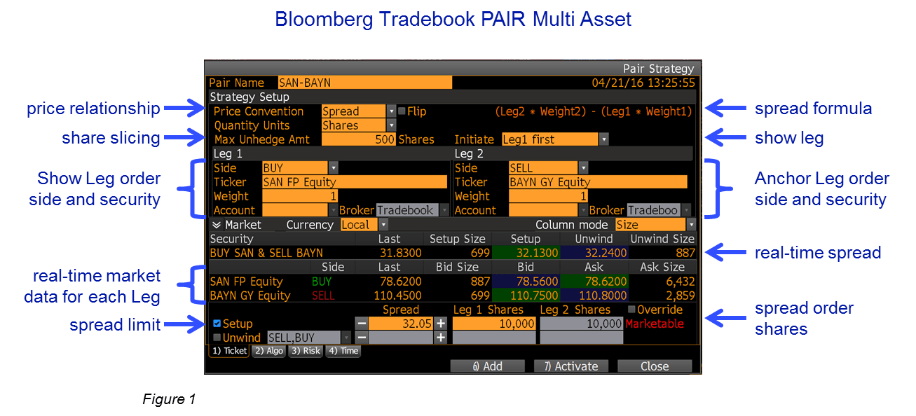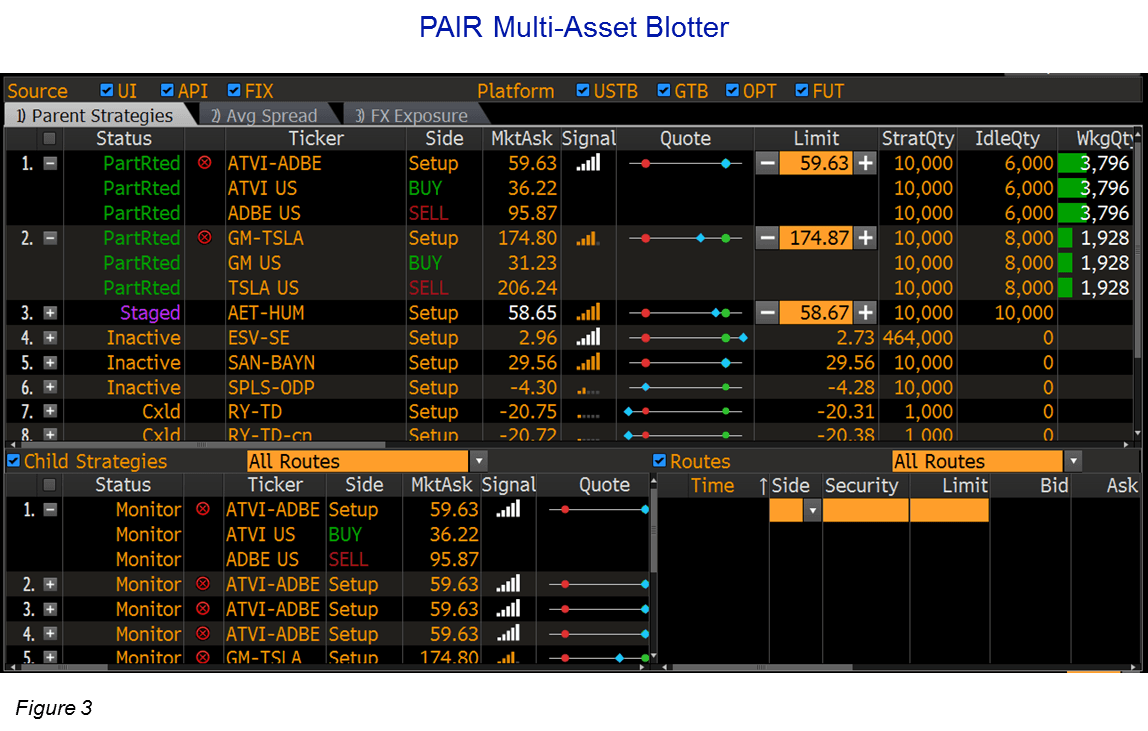 PAIR Multi-Asset is fully integrated with all of Tradebook’s Equities, Options and Futures platforms (Figure 4).  A Tradebook user is able to manage all of their cross-asset strategies on the Bloomberg Professional Terminal.