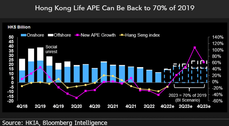 Pent-up purchase demand accumulated since the pandemic and the desire to diversify assets could drive Chinese visitors to splurge on life-insurance products in Hong Kong. According to BI insurance analyst Steven Lam, Hong Kong’s new life premiums might surge 60% this year to about 70% of 2019’s level. AIA and Prudential’s new annual premium equivalent (APE) could double in 2023.
