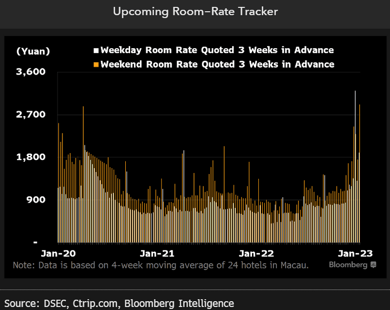 Macau hotel occupancy rates during Lunar New Year in late January could hit a record high since the pandemic began after bottoming out in March-May 2022, if advance room rates are an indication. Average room rates have jumped 171% year-over-year to $475 (3,200 yuan) and strong trends are continuing into February. Macau casino operators such as Galaxy and Sands China could post a sharp recovery in 1Q.