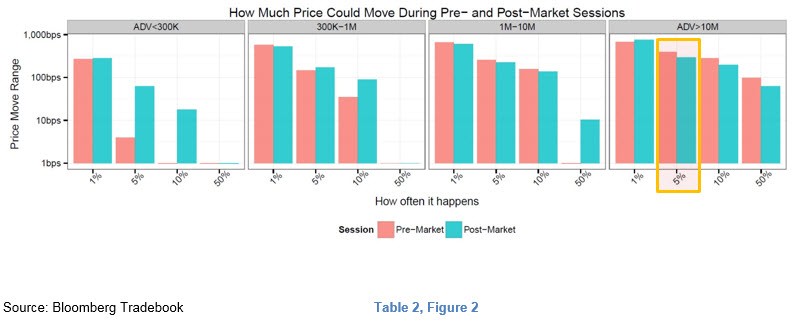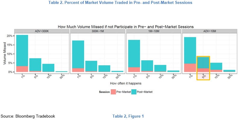To summarize the characteristics of trading in these sessions, we sampled 500 tickers from the Russell 3000 with equal representation across the market capitalization spectrum. We compute pre-open and post-close market share as a percent of daily volume and group stocks using an average 30-day daily volume number. In Table 2, we show data for selected percentile groups for ease of display. For example, a highlighted column in Table 2, Figure 1 shows that for Average Daily Volume (ADV) greater than 10M shares, pre- and post-market volume account for about 8% of the daily volume. And this happens on 5% of the days in the year—or about once a month. This represents significant trading volume and is not just an earnings-day release characteristic.