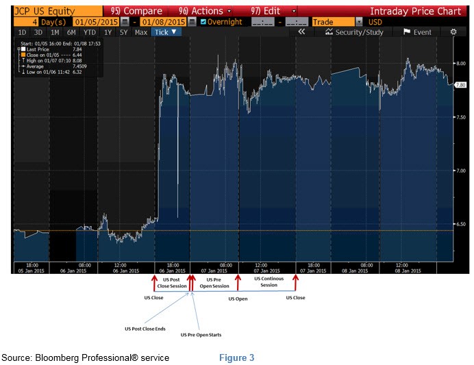 Figure 3 shows an example of pre-open and post-close trading on a intraday price chart using the Bloomberg Professional® service. For this ticker, JC Penney, we observe a 17% jump in after-hours trading associated with about 64% of the Average Daily Volume (7.1M shares in the post-close session and 6.34M shares in the next day pre-open session). Although some might point to this trading being conducted in the upstairs market, only 17.4% of this activity was indicated on the TRFs, with the other 82.6% taking place on the exchanges, with NYSE ARCA trading 6.49MM shares before next day’s official market open. Traders could have participated with this volume using tactical algorithms such as Bloomberg Tradebook’s B-Smart algorithm.